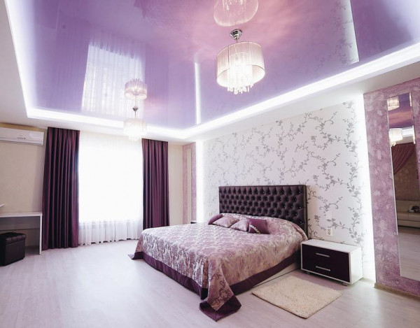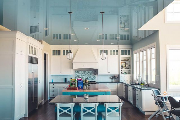Чтобы интерьер помещения стал более ярким и оригинальным, его можно дополнить цветным натяжным потолком. Такой вариант отделки не потребует много сил и времени, так как установка полотна проводится за считанные часы. Покупатели могут заказать натяжные потолки различных вариантов, отличающихся не только расцветками, но и своей фактурой – можно подобрать как матовые, так и глянцевые модели. Последние будут очень удачно смотреться в помещениях с небольшой площадью, визуально расширяя их.