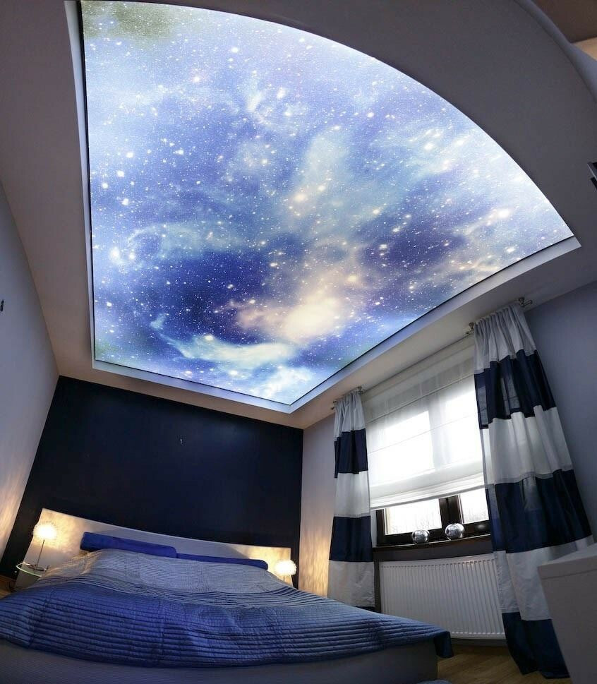 Натяжные потолки с имитацией ночного звездного неба способны создать уютную атмосферу в любом помещении. Технология предусматривает размещение небольших светодиодных лампочек по всей площади полотна. Они напоминают естественное расположение звезд на небе, благодаря чему создается очень реалистичный эффект. Натяжные потолки звездное небо с установкой в спальне или детской комнате могут выполнить роль дополнительной подсветки или ночника в темное время суток. Днем лампочки не видны, поэтому потолочное покрытие кажется однотонным.