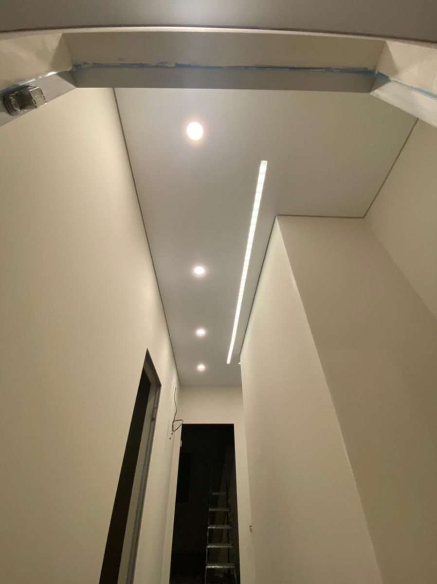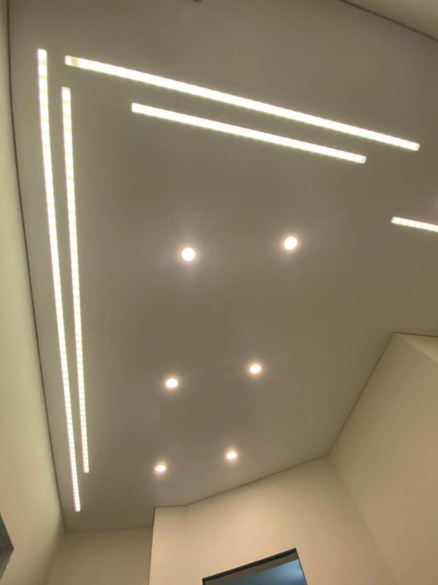 - После того, как проект размещения световых линий на натяжном потолке готов, мастер приступает к установке специальных профилей. Именно в них в последующем будут вмонтированы линии.