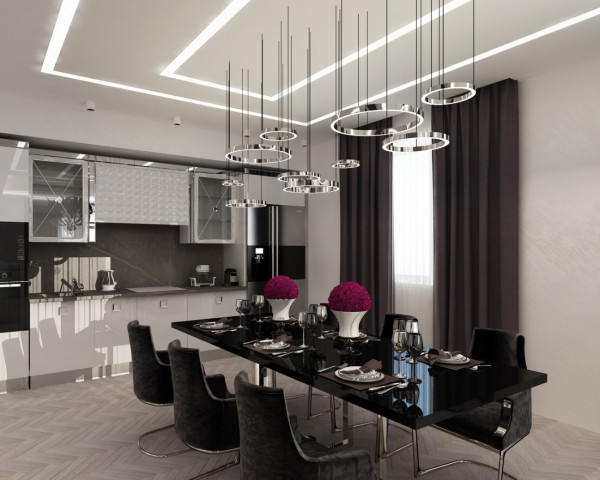 Световые линии на натяжном потолке могут иметь разный дизайн. Это могут быть простые прямые линии либо сложные геометрические узоры. Здесь все зависит от фантазии дизайнера или владельца помещения, размеров потолочного покрытия, а также стиля, который использован в основном интерьере. Довольно часто такие линии в потолке выполняют роль «перегородок», отделяя одну зону комнаты от другой. Это очень удобно, если вы не хотите строить в помещении дополнительные стенки.